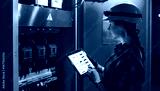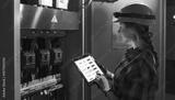 Woman engineer checks electrical panel using digital schematic. Technical inspection.