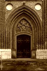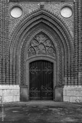 Dark gothic door of red brick basilica. Atmospheric church entrance.