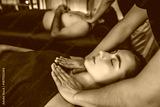 Caucasian couple customer enjoying relaxing anti-stress spa massage and pampering with beauty skin recreation leisure in warm candle lighting ambient salon spa at luxury resort or hotel. Quiescent