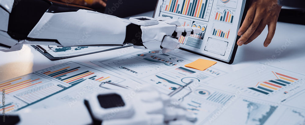 A robotic arm interacts with data charts in a modern office, showcasing the integration of artificial intelligence in business analytics and decision-making processes.Noogenesis
