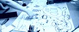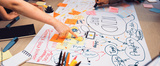 Groups of diverse hands engage in a lively brainstorming session, creating a vibrant mind map on a wooden table with colorful sticky notes and markers, promoting creativity. SACTR