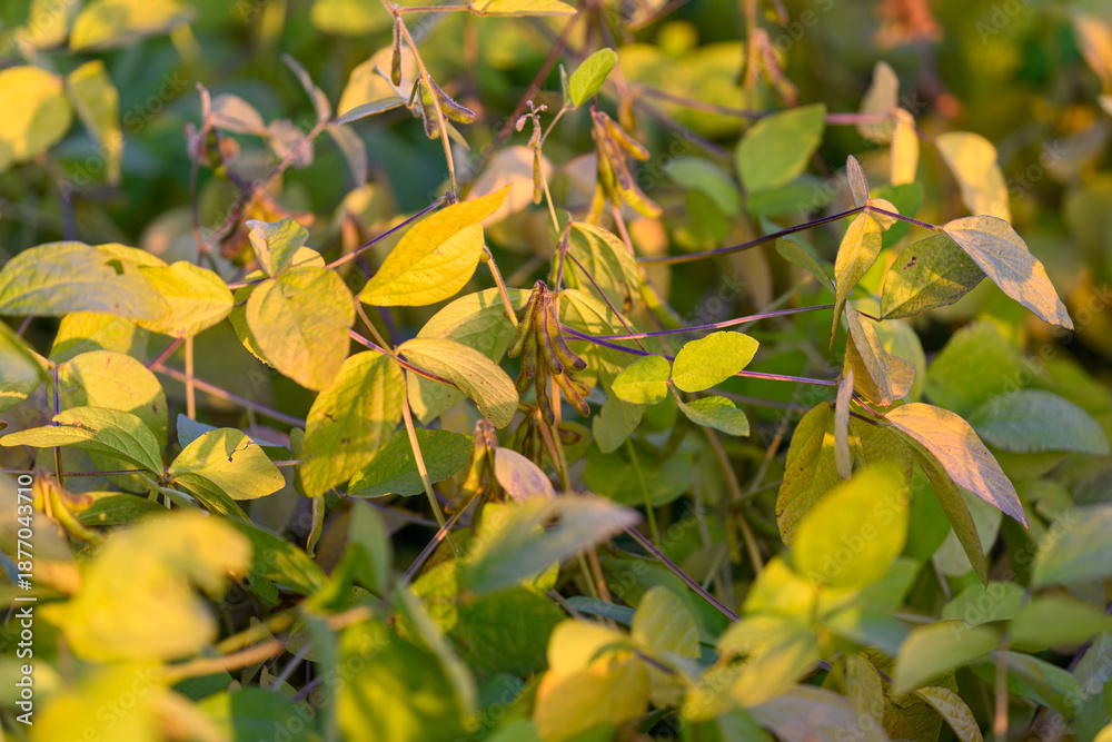 Serene countryside scene characterized by glowing soybean vegetation at sunset, Tranquil rural landscape showcasing vibrant soybean foliage bathed in warm evening sunlight