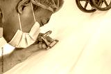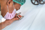 Close up of male textile worker using magnifying tool to check fabric quality inspection in factory. Asian supervisor in mask with magnifier inspecting thread details for production accuracy.
