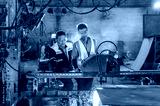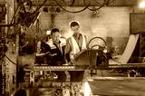 Two Male Engineers Operating CNC Machine with Sparks Flying Engineers Teamwork in Controlling Automated Cutting Machine Mentor and Technician Learning CNC Operation in a Dusty Environment.