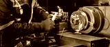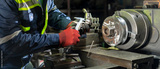 Engineer Using Caliper for Manual Inspection of Metal Part Machinist Checking Equipment in a Dirty and Messy Workshop Engineer with Safety Glasses Using Precision Tool on Machinery.