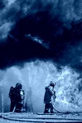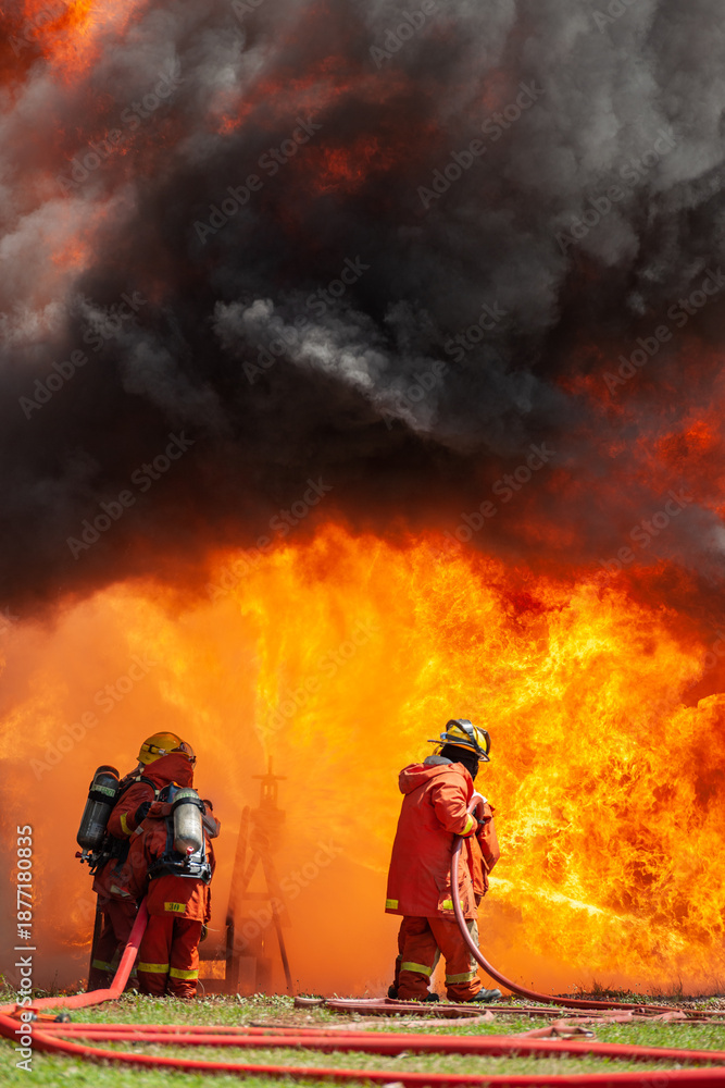 firefighter training new fireman team stop Fire. Brave Firefighter help child by hold boy in his arms in case of fire and smoke. Fireman help protection children from big smoke.