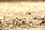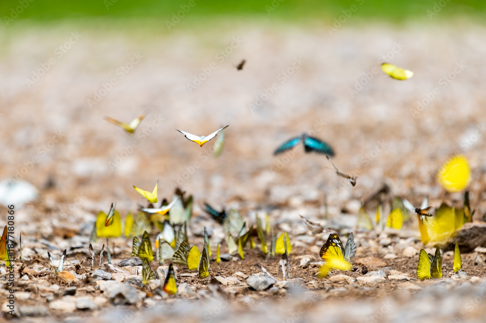 Many tropical colorful Butterflies swarm eats minerals in salinized soil land at National Park forest jungle. Group of small butterfly puddling on salt earth ground and flying in nature.
