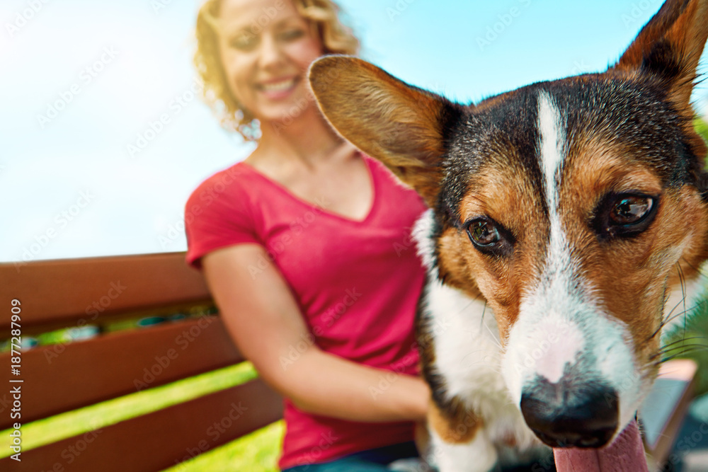 Pet, woman and relax with dog on park bench for animal adoption, connection or bonding together. Cardigan corgi, love or happy person in nature with companion for foster care, loyalty or rest outdoor