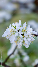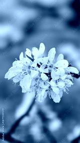 White flower blossom with delicate petals and yellow stamens covered in morning dew on blurred natural background