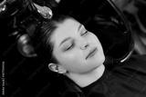 Young caucasian female enjoying relaxing hair wash at modern salon, top view