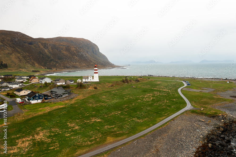 Lighthouse on a green grassy hill with sea and mountains along the Norwegian coastline.