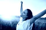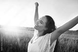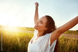 Travel, freedom and woman at field with smile for adventure, vacation or reflection in countryside. Arms up, meadow and happy person in nature on getaway trip at sunset with flare, space and thinking