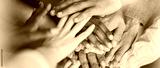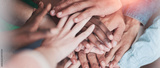 University, above or hands together with motivation, team victory or support in group assignment. College, success or people with handstack, collaboration or milestone reach in academic course.