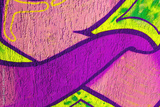 Close-up of abstract graffiti - bright purple, yellow, pink colors, black outlines. 90s style, fluorescent paint, groovy street art vibe. Urban wall texture, background, digital art, creative banner