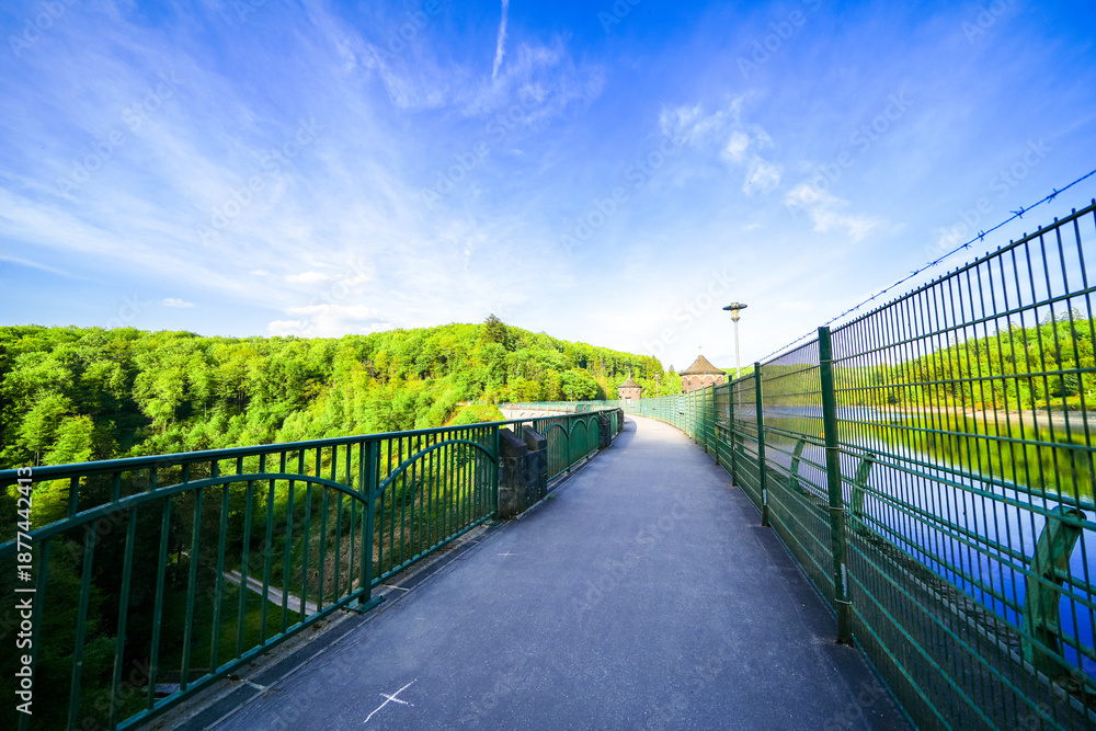 View of the Sengbach Dam and the surrounding landscape. Solingen Dam in Solingen.