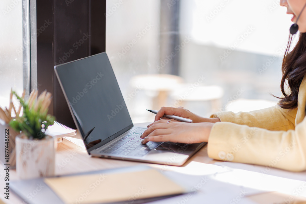 Young female call center operator with hands-free headset talking with client in home office. Concept of remote work. Back view