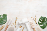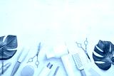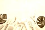 Hairdresser tools and green tropical leaves on light wooden texture background with free space at top