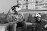 Diverse male friends wearing vr headsets with controllers on sofa in living room