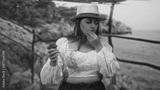 Woman holding icecream cone in hands with a slight pout near a rustic building railing on a cliff by the sea; quiet disappointment.