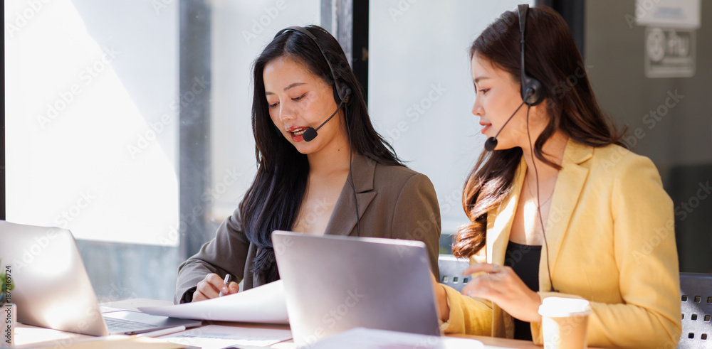 Business woman, call center and laptop with communication for customer service, coworking and talk with client. Discussion, contact us and consultant with colleague by PC for CRM, inbound or help