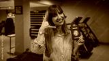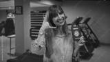 Woman smiling and holding a mexico passport while making a call me hand gesture inside a gym building with treadmills visible; travel excitement.