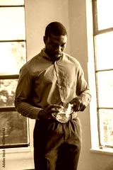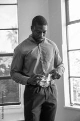 African american man in blue shirt pouring golden liquid between mugs near windows in studio