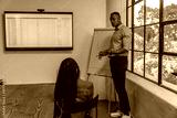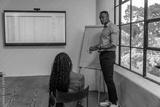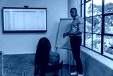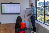 African american colleagues presenting line graph on flip chart at conference table, copy space