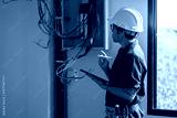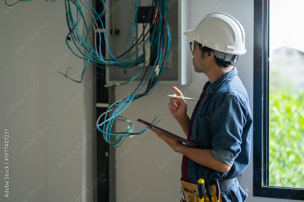 Asian electrical engineer wearing safety helmet inspecting home electrical system with tools and tablet at indoor building site at new home