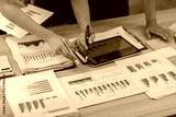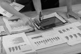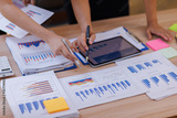 Group of confident business people point to graphs and charts to analyze market data, balance sheet, account, net profit to plan new sales strategies to increase production capacity.