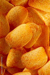 Hot Spicy Potato Chips, top view. Flat lay, overhead, from above.