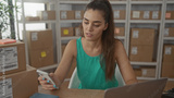 Woman looks at laptop screen while holding smartphone with bare hand and sealed package atop desk in building; stress.