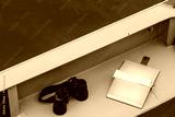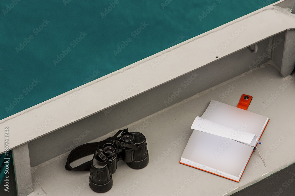 a binoculars and a notepad for notebooks left on the deck of a warship. accessories of a Marine Navy officer.