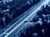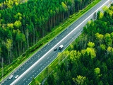 Aerial View of a Highway with cars and cargo delivery trucks Surrounded by Lush Green Forest and Vibrant Vegetation
