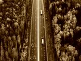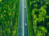 Aerial View of Two Trucks on a Highway Surrounded by Lush Green Forested Landscape