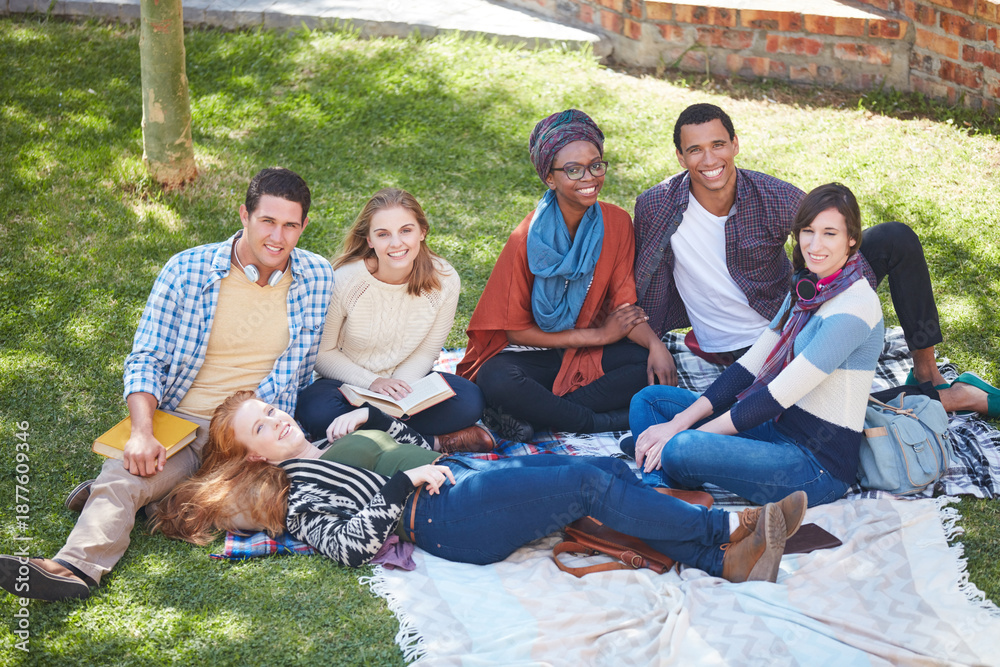 Education, people and students outdoor for studying at university, campus or school for exam. Happy, diversity and portrait of friends in college park with group project, assignment or test together