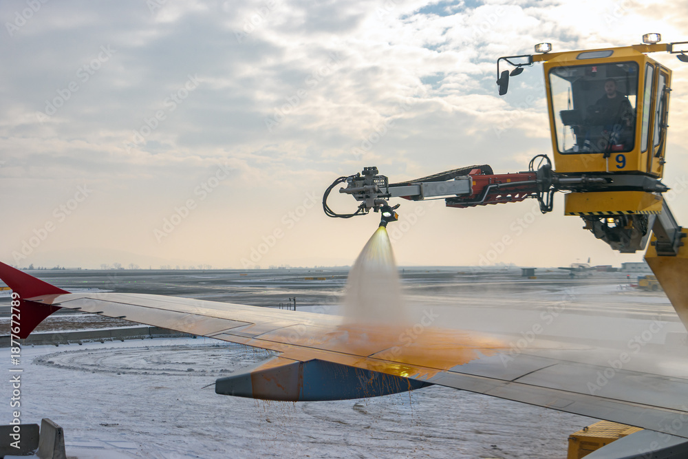 Ground Crew Spraying De-icing Fluid on Airplane Wing During Winter Operations