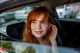 Beautiful Redhead Woman Looking Out Car Window and Smiling, Thoughtful Female Passenger with Ginger Hair, Lifestyle Portrait of Young Girl During Commute, Travel and Reflection Concept.