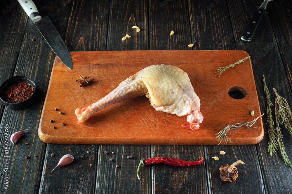 A turkey leg is placed on a wooden cutting board in a kitchen. Surrounding the meat are various spices and a kitchen knife. The scene shows preparation for cooking
