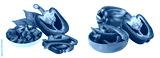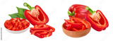 slices of red sweet bell pepper in ceramic and wooden bowl isolated on white background with full depth of field