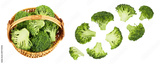 fresh broccoli in wicker basket isolated on white background close-up with full depth of field. Top view. Flat lay