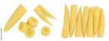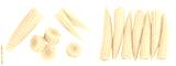 Pickled young baby corn cobs isolated on white background. Top view. Flat lay