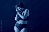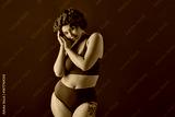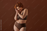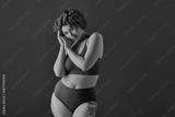 Curvy woman with short curly hair embraces body positivity in studio setting