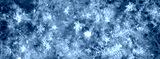 Macro photography of delicate ice and hoarfrost crystals forming natural snowflake patterns on a deep blue winter background, ideal for seasonal, cold, and abstract concepts.