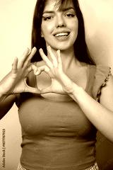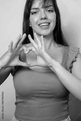 Young woman forms heart shape with fingers and smiles while standing indoors in front of a simple background