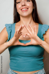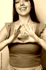 Woman making a heart shape with her hands, smiling at the camera in a bright indoor setting during daytime