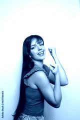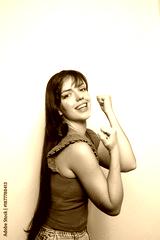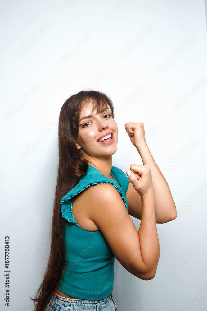 Woman flexes her muscles and smiles with confidence in a studio setting during the day