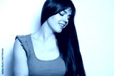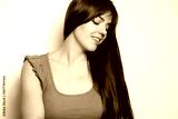 Young woman smiles while looking down in a studio setting with simple background and natural light during daytime