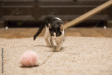 Hunting kitten playing wand with pink fluffy ball at home. Young cat portrait
