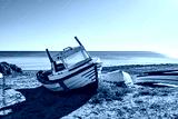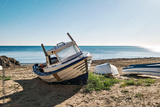 Old wooden fishing boat on sandy beach near calm Mediterranean Sea under clear blue sky. La Mata beach, Torrevieja, Alicante province, Costa Blanca. Spain
