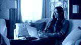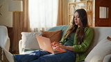 Freelancer working computer task sitting sofa. Focused woman texting laptop